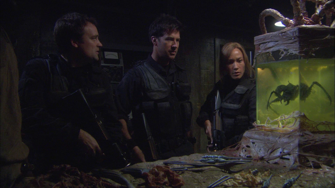 The silence from the transplanted Taranin people worries Elizabeth and she sends the team to investigate, upon arrival they found the settlement empty but knowing it was built upon a huge complex of tunnels holds out hope that the people have moved underground perhaps to safeguard themselves from the Wraith. As the team searches the complex they detect a lifeform but then are attacked by a large creature, they wound it and as it flees they find a store room full of dead bodies, they have discovered the fate of the Taranins. In an adjacent room there is a large pod/cocoon and Ronon going walkabout finds the lab with the remnants of carnage and an Iratus bug in a container, having lost contact with the Marines sent as backup they return to the Stargate only to find that the control crystal of the DHD has been removed, they have no option but to return to the underground complex and search for whoever is responsible.