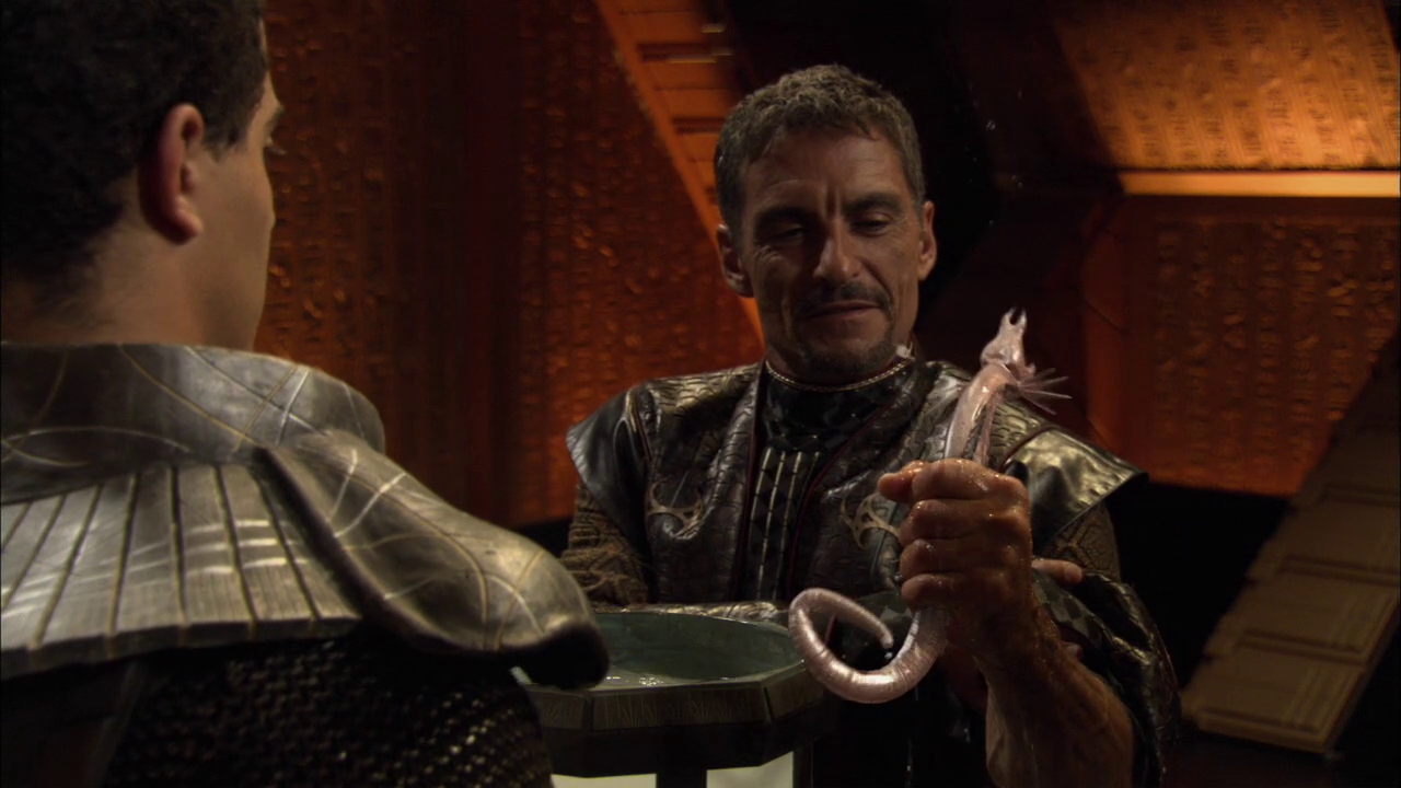They come across a special ops team under the command of Jack O’Neill and are returned to a US nuclear submarine, Sam is recognised as a Shuttle commander who dies when her craft crashed in the ocean a few years ago and when they find Daniel on the sub they confirm that the timeline has changed. If Ba’al had been able to alter the history of the Stargate use then the SGC and humans would not have had such a strong influence on the galaxy. The added bonus for Ba’al would be that as the puppet master he may have been in a position to make changes which directly benefited him with his knowledge of events and technology present in the original timeline. The US government of this new timeline are not keen on upsetting the apple cart but a year later Ba’al has consolidated his control of the System Lords and brings a fleet to Earth and makes a phone call to the President…